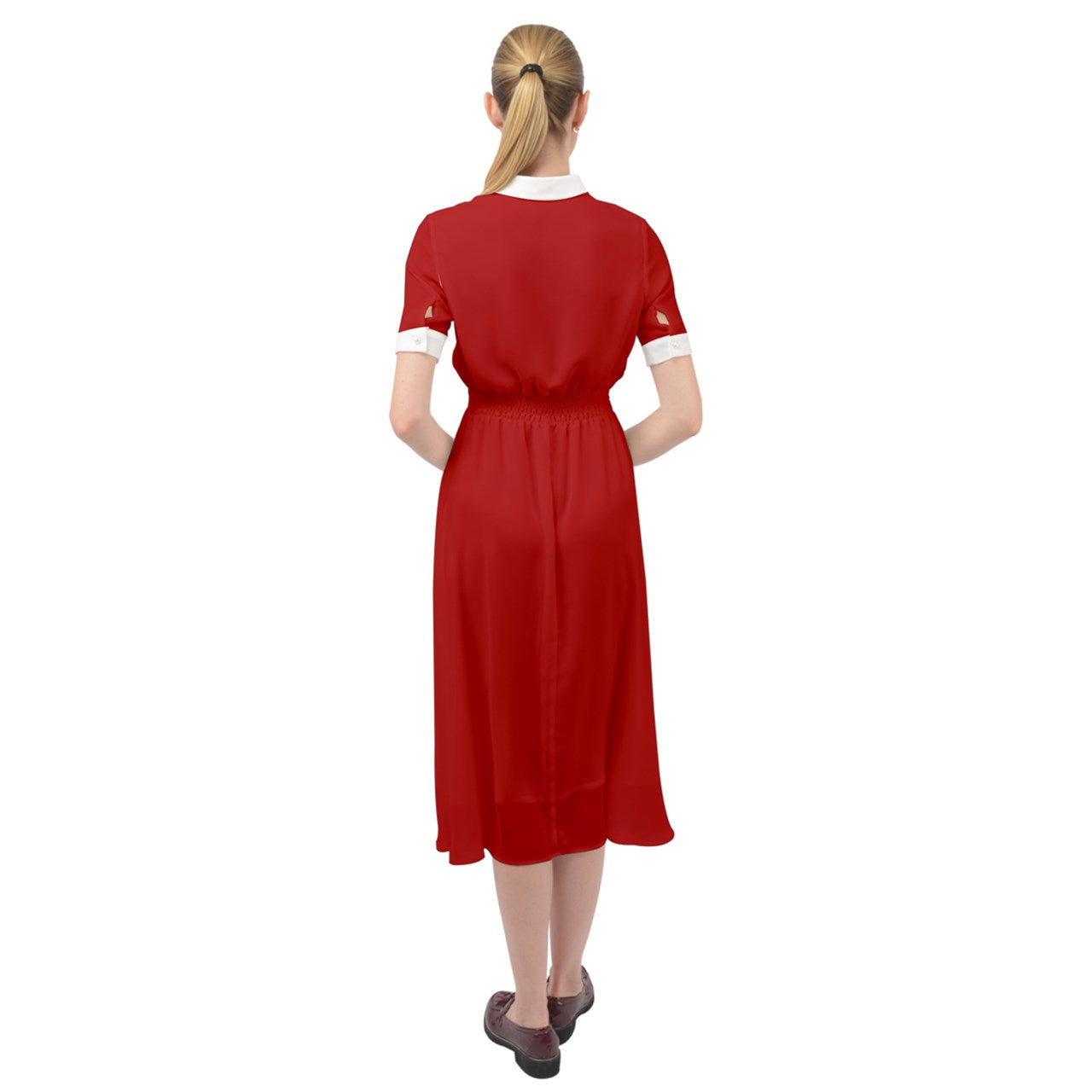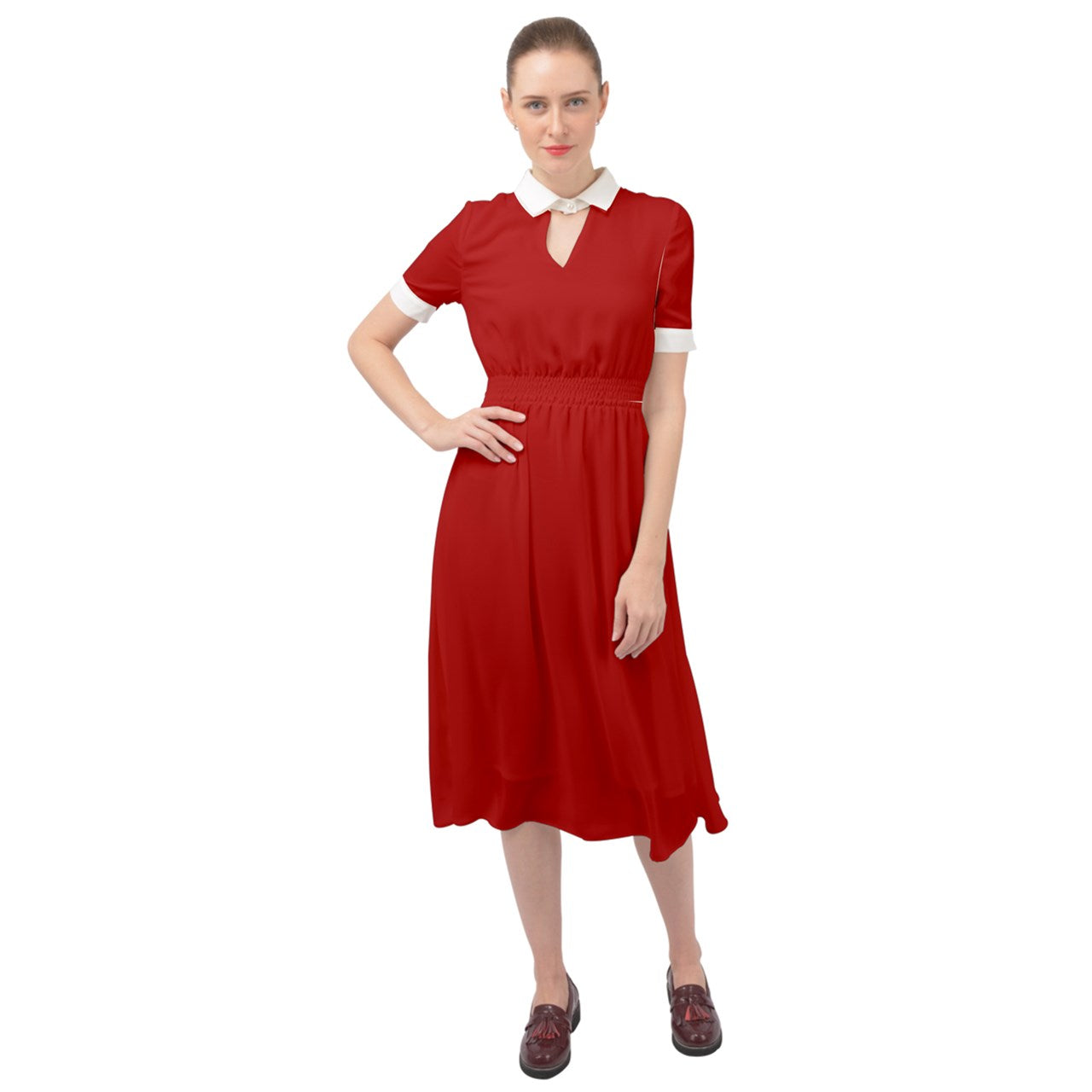 Our chiffon range's new addition midi dress that comes with a cutout neckline. Design it with your favorite prints and artwork to create the perfect dress.